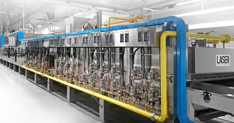 of the tunnel oven both in the upper and in the lower part of the conveyor to allow baking in a manner flexible according to needs. about 15% of these burners are tri-flame with the possibility of adjusting on the left, in the center and on the right the power and make the cooking of the product uniform over the entire width of the band. Every burner is equipped with a double gas safety valve and a dedicated flame control and can be used natural gas or LPG indiscriminately thanks to a simple recalibration of the mixer of each burner while aspiration it is guaranteed by a central duct that guarantees constant suction with the least possible turbulence.